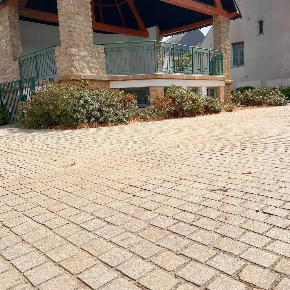 Ce chantier réalisé par ID Verde, s’est distingué par le choix d’une finition grenaillée offrant un rendu antidérapant. C’est aussi la finition la plus adaptée aux granits jaune beige, contrairement à une finition flammée. En effet, ces granits composés de pyrite de fer, subissent une réaction chimique lors du flammage, transformant leur couleur jaune beige en rose.
